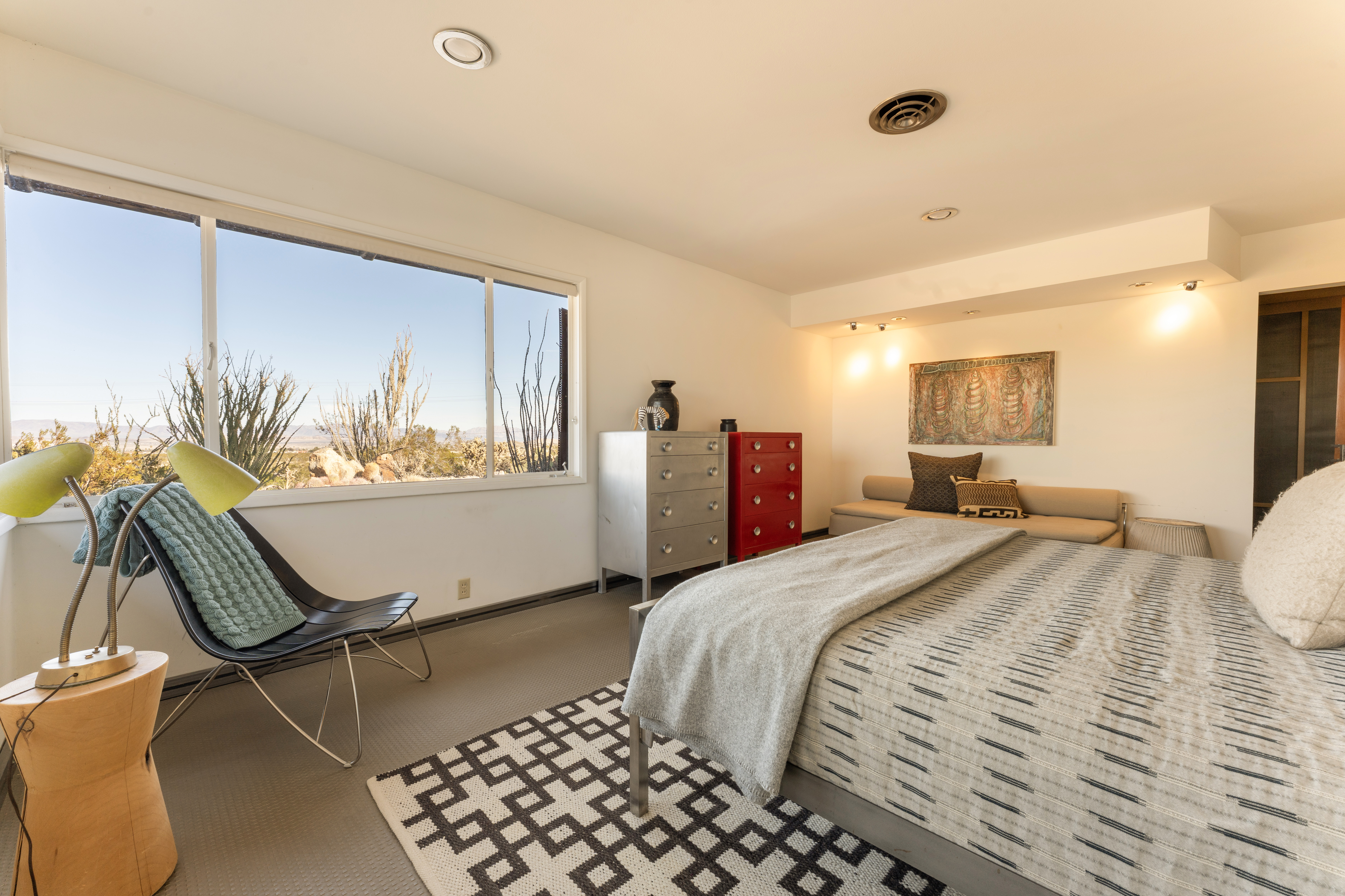 - Light-filled living room with original art and custom lighting